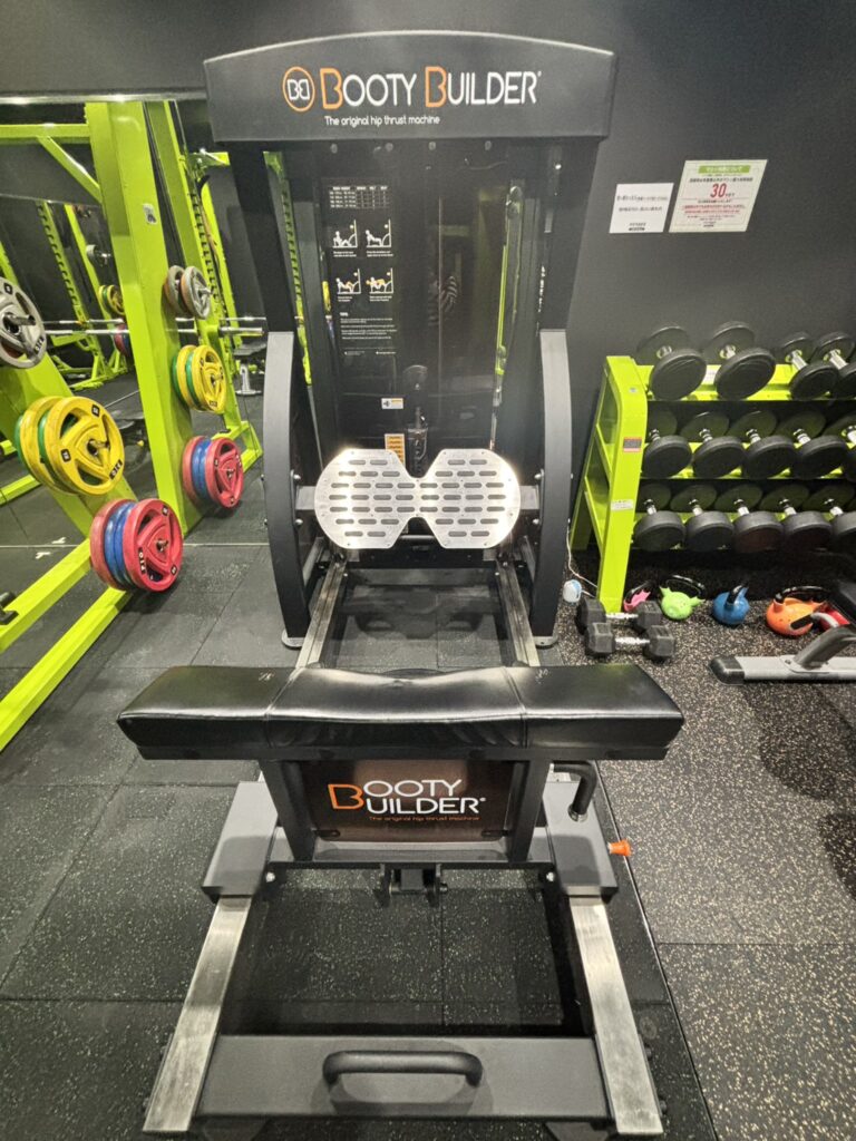 ヒップスラストマシンです。背もたれが細い為、可動域がとりやすく効率的にお尻を鍛えられます。